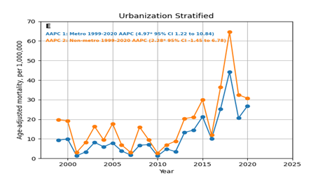 Data for urbanization revealed that in the years 1999-2020 Urban areas had the larger number of deaths 26,718 with the average AAMR 12.46 per million (95% CI 12.31-12.61) and the highest AMR reported in 2018 at 44.19 per million (95% CI 42.97-42.54). Rural areas had 8,542 deaths in these years with the average AAMR 18.66 per million (95% CI 18.27-19.06) and the highest AAMR reported in 2018 at 64.57 per million (95% CI 61.27-67.88). Both Urban and Non-Urban areas had significant increase in mortality rates with AAPCs of 4.97* (95% CI 1.22-10.84) (p value <0>