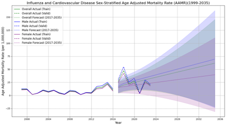 Figure 7 ARIMA Future Forecast of Influenza and CVD-related AAMR per 1,000,000 in the United States, 1999 to 2023