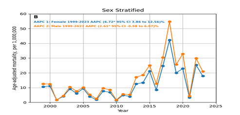 Our results also reveal sex-specific differences, with males exhibiting higher absolute AAMRs but females showing a sharper proportional rise (AAPC = 6.72; p < 0>