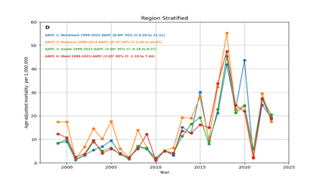 Mortality trends for Influenza related CVD were segregated into four geographical areas i.e. Northeast, Midwest, South and Western regions. The highest number of casualties occurred in South (14,406) deaths, followed by Midwest (11,116), West (9,066) and Northeast (8,143) from 1999 to 2023. The highest average AAMR was recorded in the Midwest at 16.03 (95% CI 15.7-16.35) per million in 1999-2020 while the highest average AAMR in 2021-2023 was in the South region reported as 18.17 (95% CI 17.51-18.82) per million. South region had the lowest average AAMR 12.15 per million (95% CI 11.93-12.37) in 1999-2020 and Northeast with lowest in 2021-2023 with average AAMR of 15.57 per million (95%CI 14.71-16.43) Each region had a rise in AAPCs however Northeast had the maximum rise with AAPC 8.89* (95% CI 6.26-15.21)(p value<0>